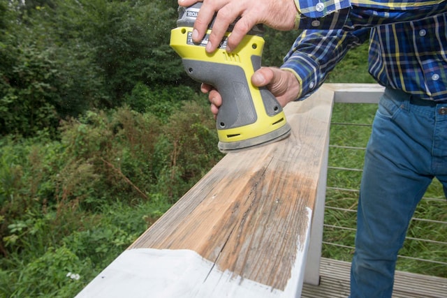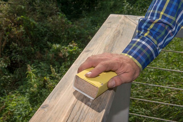 Schritt 1: Entferne die abgewitterte Farbe vollständig, um einen tragfähigen Untergrund zu schaffen. Verwende dazu handelsübliches Schleifpapier mit einer 60-er oder 80-er Körnung und lege einen Atemschutz an.