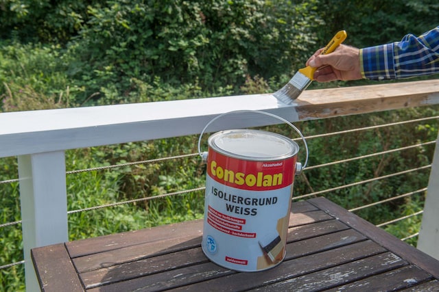 Schritt 4: Wenn das Geländer einen hellen Endanstrich, zum Beispiel Weiß, Nordisch Gelb, Grau und Silbergrau, erhalten soll, trag Isoliergrund auf. Der Isoliergrund Weiß von Consolan schützt vor Verfärbungen durch Holzinhaltsstoffe. Dazu sind in der Regel zwei satte Pinselanstriche bzw. drei Rolleraufträge nötig. Dazwischen eine Trocknungszeit von ca. drei bis vier Stunden einhalten.
