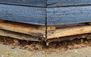 Im nächsten Renovierungsschritt hat er verfaulte Teile der Unterkonstruktion entfernt und durch Steine ersetzt. Die beiden darüberliegenden Bretter der Verkleidung hat Simon mit Douglasiendielen ausgebessert und dabei unten einen Spalt frei gelassen. So kann Luft unter dem Holzpavillon zirkulieren. Dass Holz keinen direkten Bodenkontakt hat, ist eine wichtige Maßnahme, damit es lange erhalten bleibt.