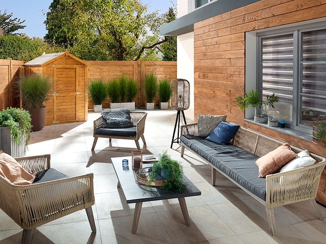Deckt die Arbeitsumgebung ab und bindet Pflanzen zurück. Vor dem Streichen solltet ihr den Farbton an einer verdeckten Stelle auf eurer Holzfassade prüfen.