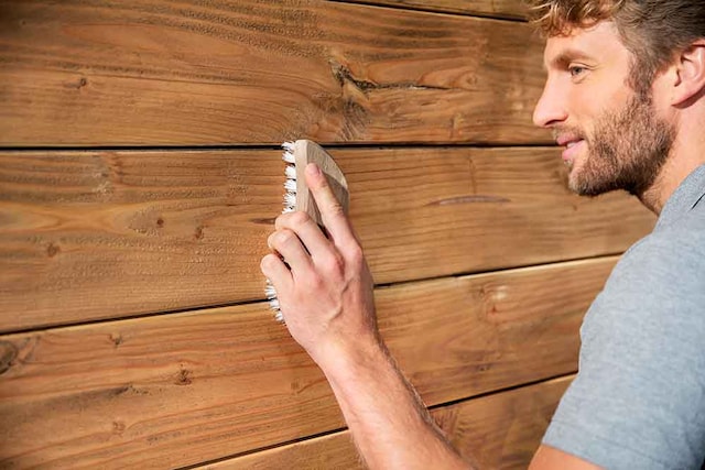 Behandeltes Holz: Entfernt mit einer Wurzelbürste groben Schmutz von der Oberfläche, schleift sie anschließend an und bürstet den Schleifstaub ab.