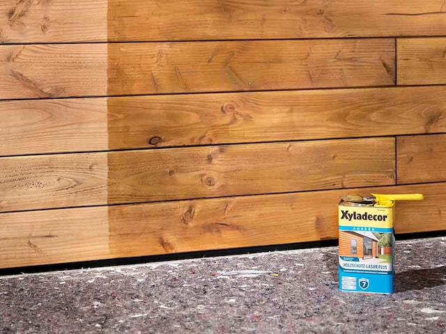 Eine Holzschutzlasur hingegen enthält weniger Farbpigmente als eine Farbe und ist deshalb durchscheinend. Hat eure Holzfassade eine ansprechende Farbe und Maserung, könnt ihr diese mit einer Holzschutzlasur wie unserer Holzschutz-Lasur Plus streichen, um sie hervorzuheben.